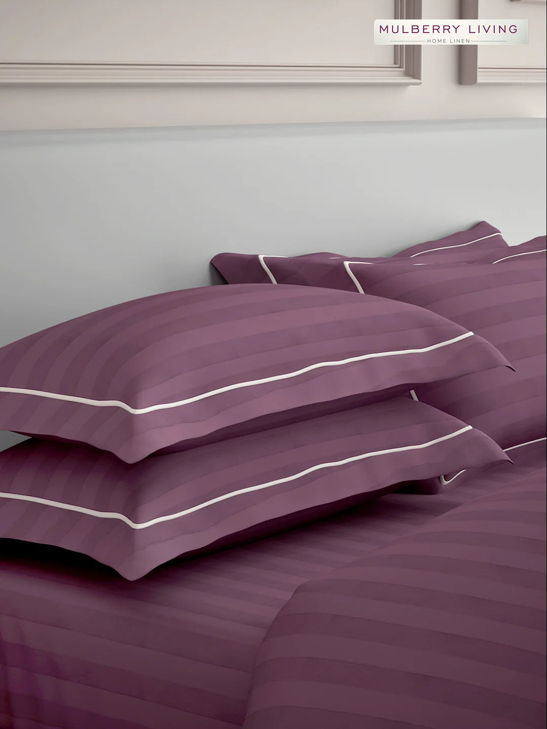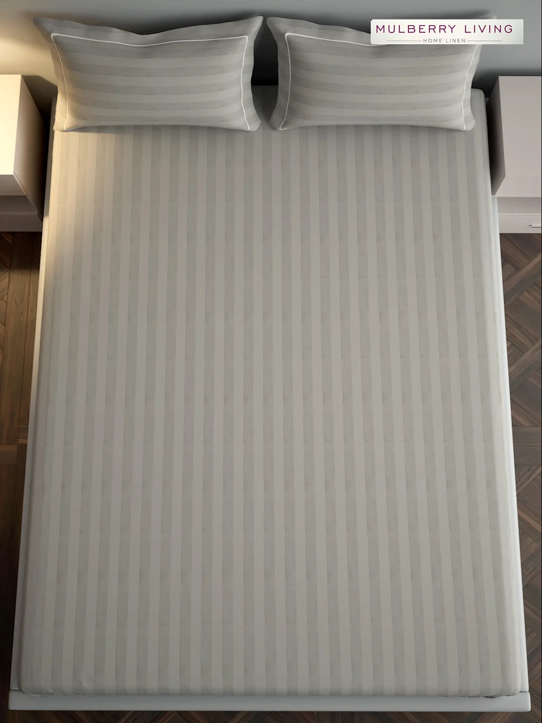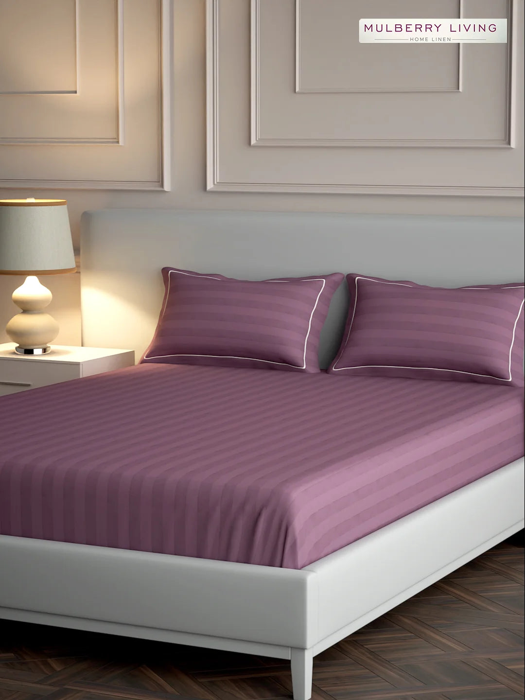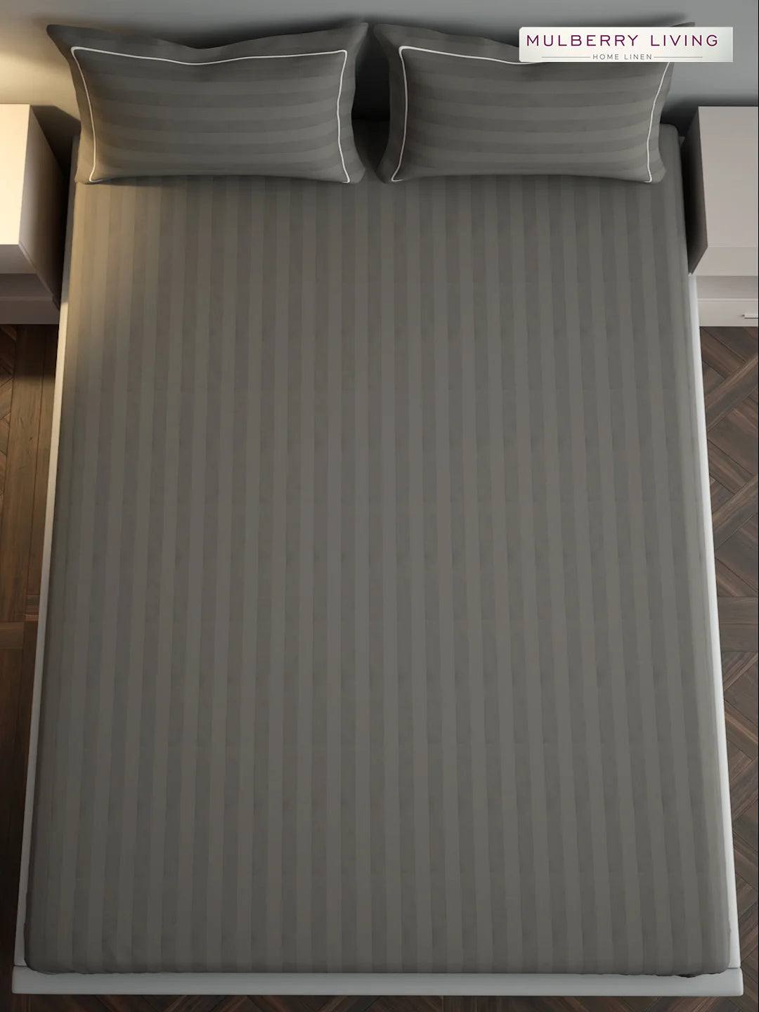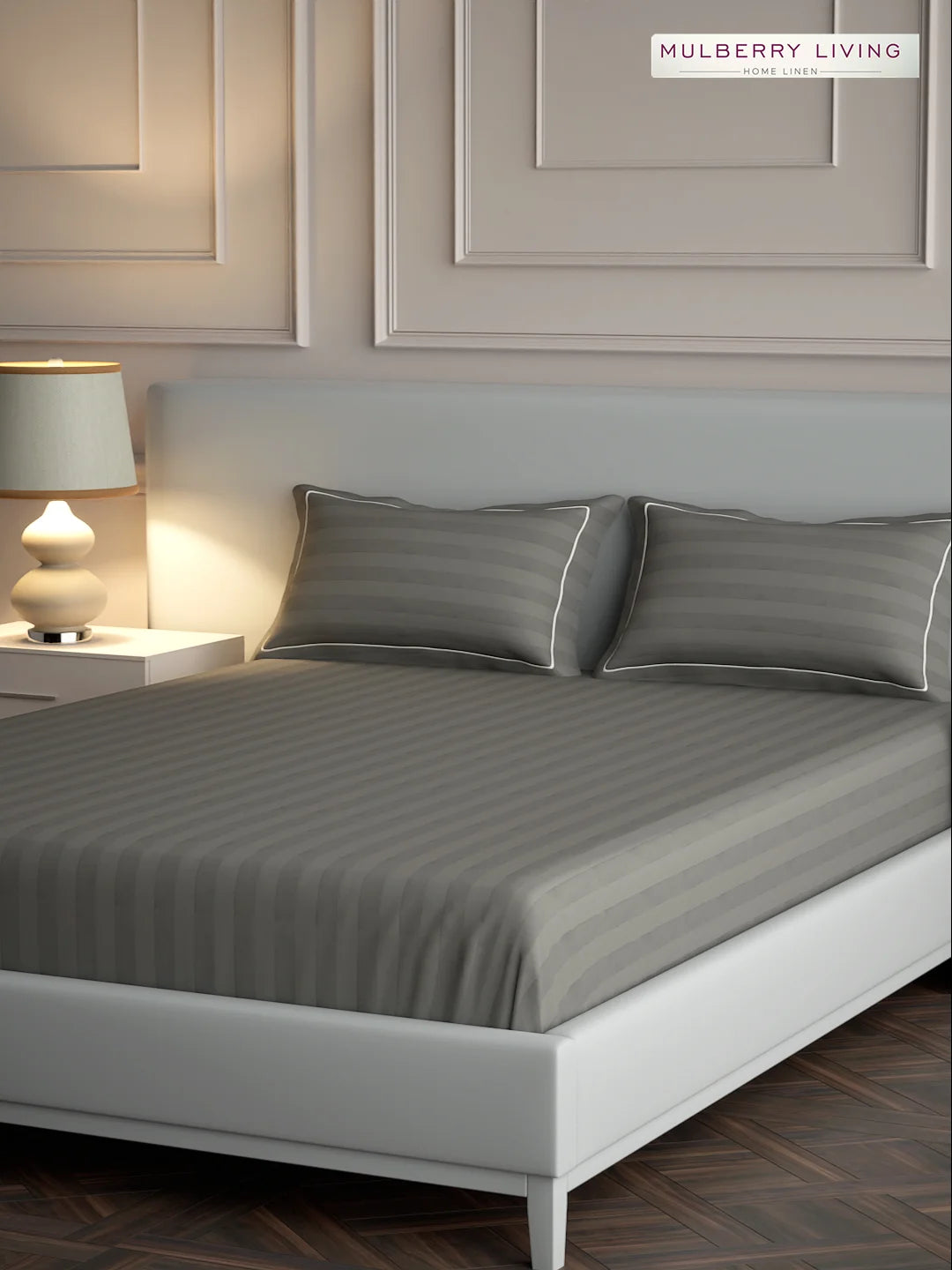 Transform your bedroom sanctuary with the Elysian Stripes Bedsheet Set. This refined flat bedsheet showcases subtle white striped patterns on premium 100% cotton fabric with a luxurious 300 thread count. It comes paired with two coordinating pillow covers. The fine quality cotton ensures breathable comfort while being conveniently machine washable for enduring elegance.